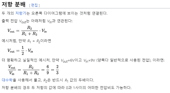 아두이노 마이크로컨트롤러를 비롯한, 대부분의 마이크로컨트롤러는 저항을 읽어야 위의 온도그래프에 의한 온도값의 표현이 가능하고, 가장 기초적으로 전압분배법칙 회로등을 통하여 얻은 전압 값을 아날로그 신호로 읽어 그 전압 값을 토대로 저항을 계산하여 온도를 나탈낼 수 있다. 즉 전압이 있어야 저항을 계산할 수 있고, 이것은 디지털 멀티테스터기가 저항을 읽는 방법과 같다고 할 수있다. 아래 회로에서 Vout의 전압을 읽고 R1 또는 R2에 해당하는 저항을 계산 할 수있다.