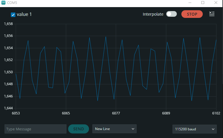 아무것도 연결되지 않은 상태 일 때의 측정 mV를 시리얼플로터로 출력해보았다. 순간적으로 관찰해보았을때 0.20mV 정도의 노이즈를 보인다. 노이즈일 수도 있지만 기준전압 자체가 불안정한 현상일 수 도 있을 것이다.