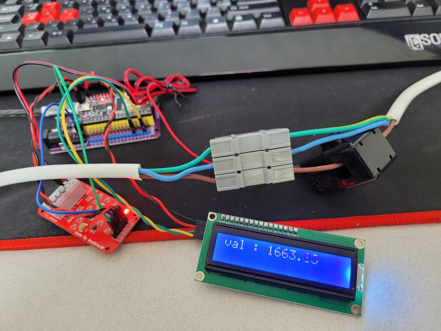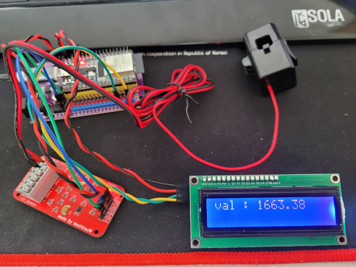 CT 센서와 연결하여 기준(Reference) 전압을 출력해보았다. 1663.38mV (1.66V) ~ 1646.00mV (1.64V) 가 측정되었는데 기준 전압 오차가 0.01V 정도 되는 것 같다. 전압분배기의 저항기의 오차율을 고려해 볼 때 그럭저럭 나올만한 결과 인것 같다.