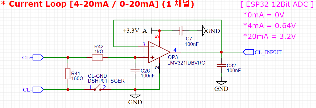 - 3.2V를 사용한 이유는 Rail to Rail OPAMP 특성으로 최대 출력 전압이 100mV 정도 낮아지기 때문이다.