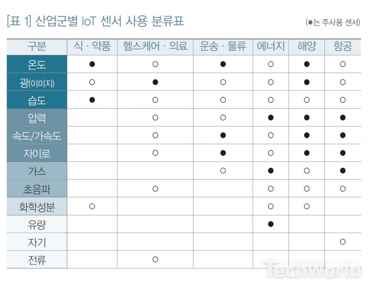 - 다음은 목적 용도별로 어떤 센서가 필요할 것인지 예시로 정리한 표다.