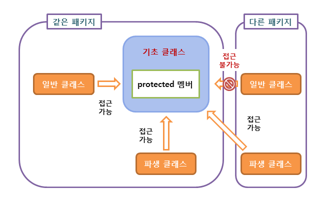 - protected로 선언된 멤버는 해당 클래스와 그 클래스를 상속받은 파생(기초) 클래스에서만 접근 가능.