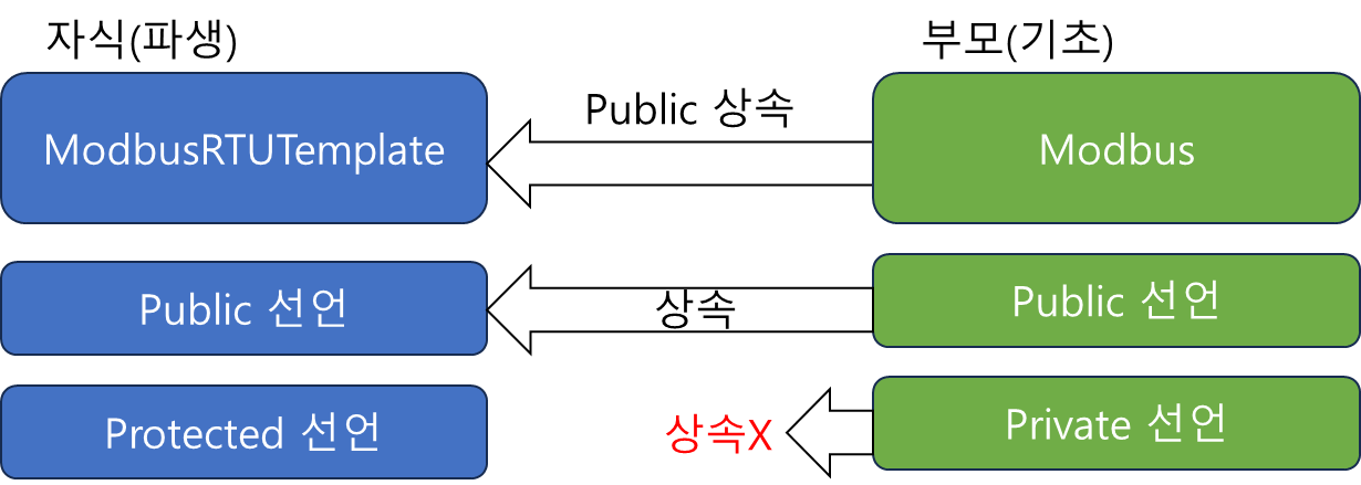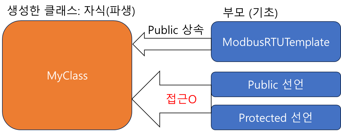 (1) ModbusRTUTemplate 라는 클래스가 Public 으로 Modbus 클래스를 상속받았다.