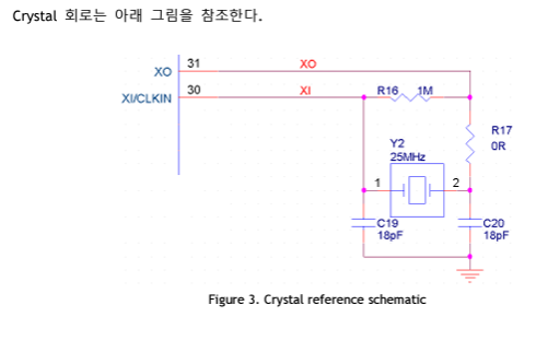 - 외부 25MHz 오실레이터를 연결하라고 명시 되어있다. 조금 설명이 복잡한데 아래 참고 회로도를 확인하면 금방 이해할 수 있다. 다만, 왜 사용되는지 의구심이 들지만 설계한 제조사가 저렇게 달아주라하니 우리는 그냥 데이터 시트 대로 따라 하면 된다.