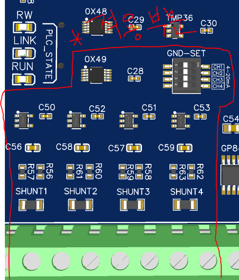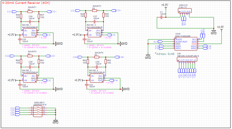 - 즉, 22mA 전류를 흘렀을때 션트저항에 걸리는 전압은 0.066V가 되고 CSA는 이의 50배를 출력하므로 3.3V가 된다.