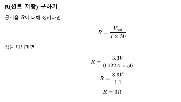 - Vout = 원하는 출력 V, I = 원하는 출력에서의 전류 A, R = 션트저항기 값