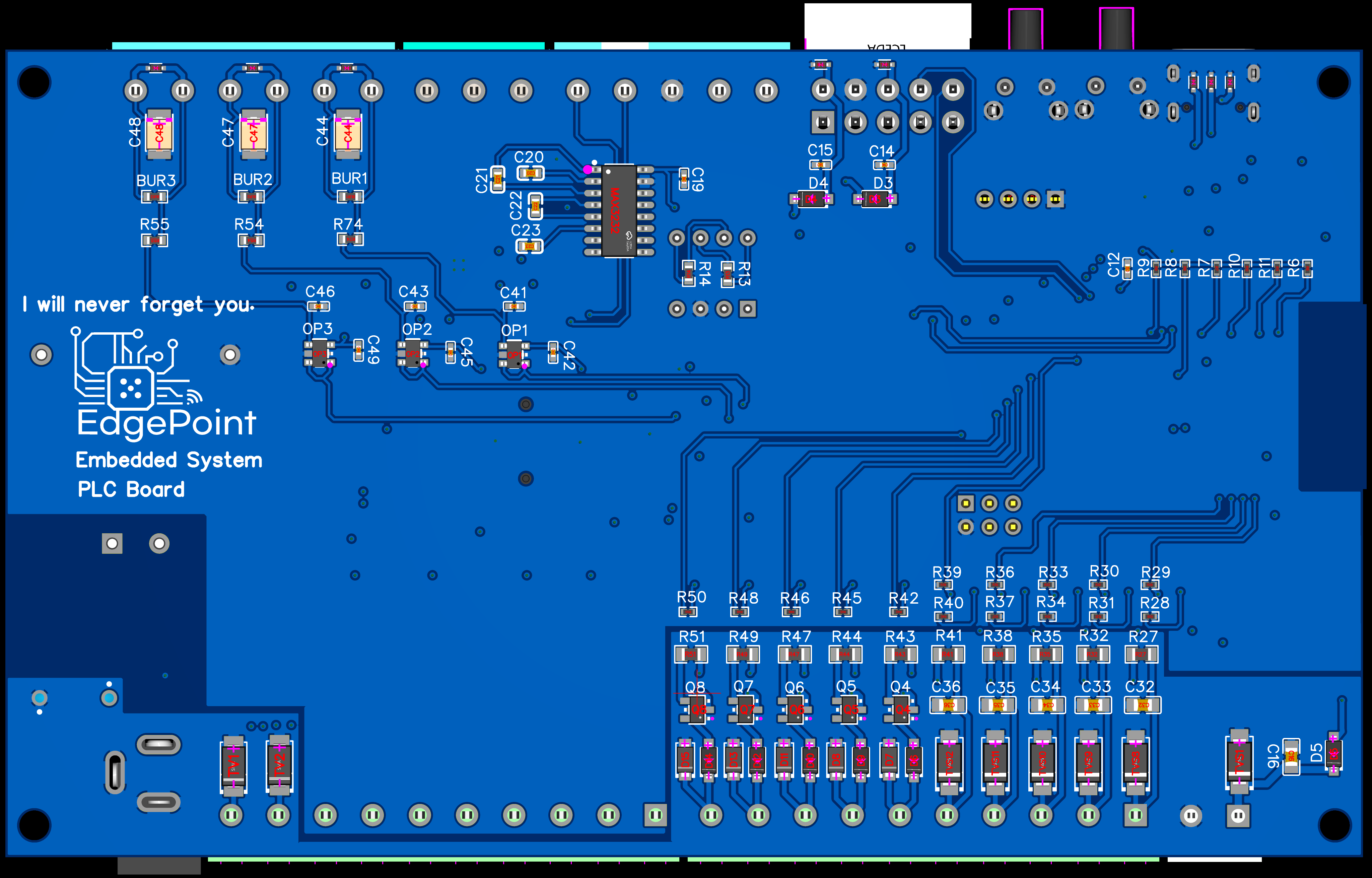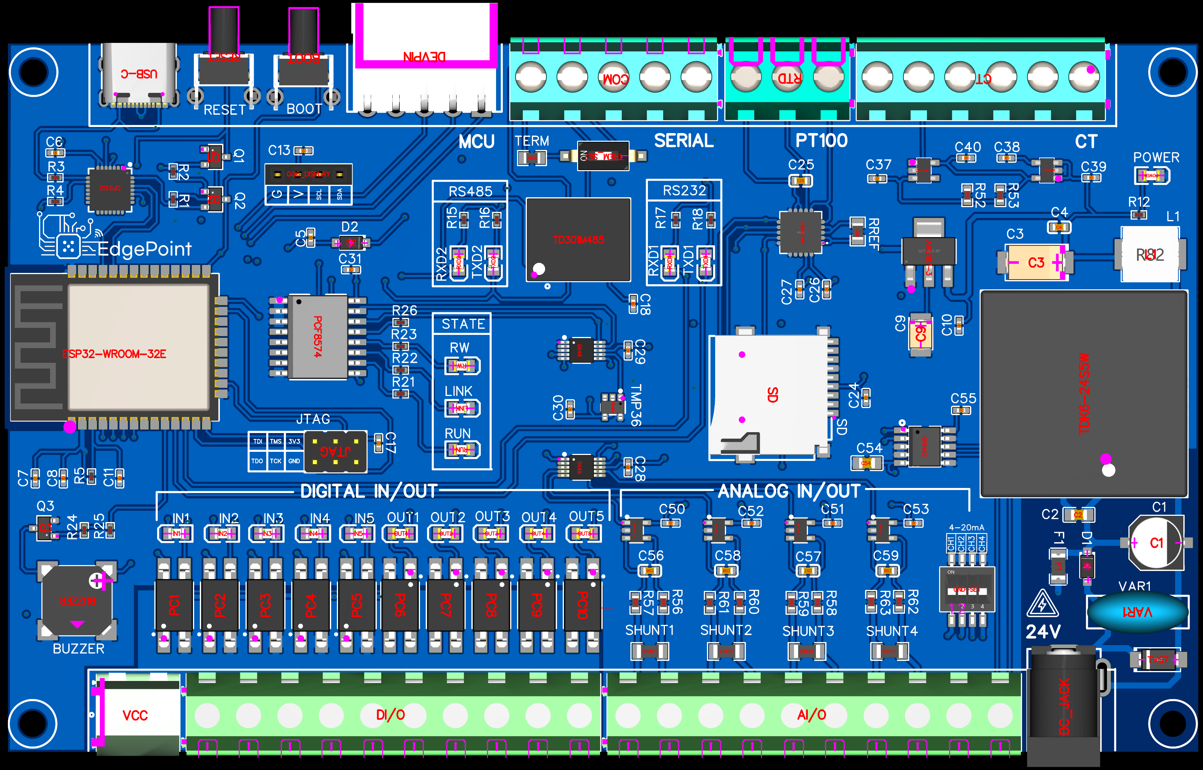 - 블루, 레드, 그린의 시그널 레이어와 실크스크린의 조화도 하나의 디자인 요소.