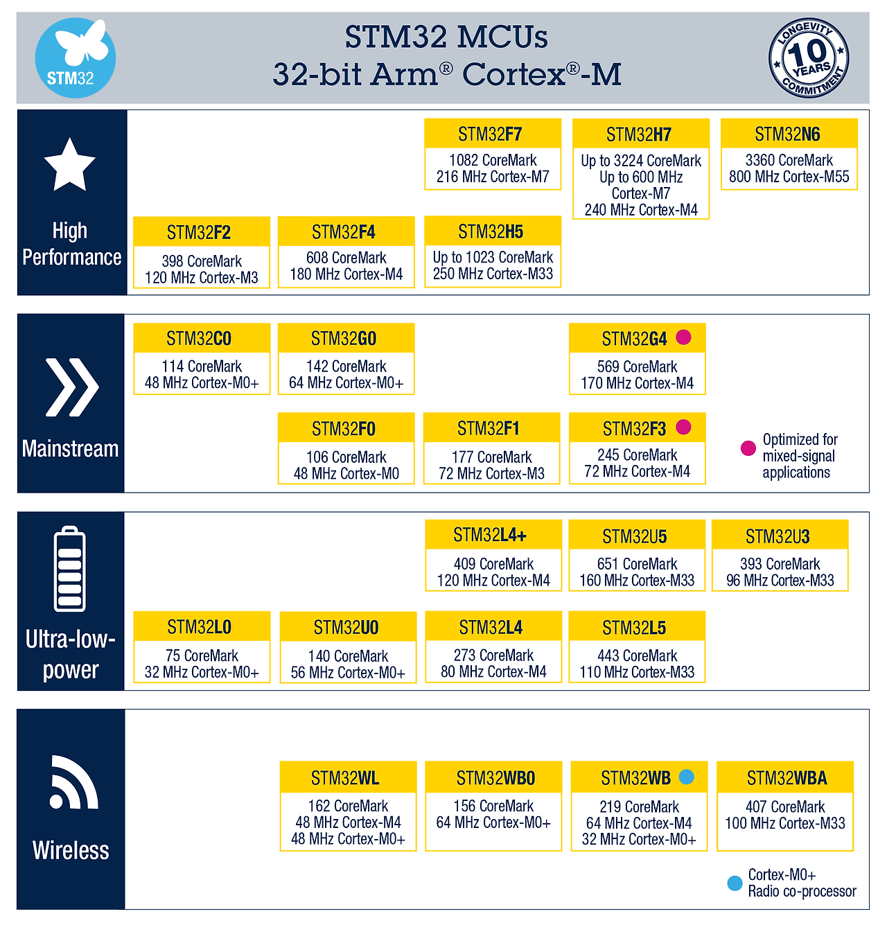 - 저전력 L 시리즈(L0, L4), FPU 지원 H 시리즈(H7) 등 다양한 라인업 존재