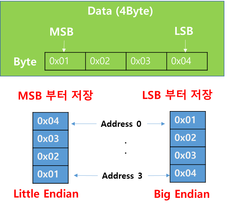 CPU는 데이터를 메모리에 MSB 부터 저장할 것 인지, LSB 부터 저장할 것 인지에 따른 저장 순서에 의해 리틀 엔디안(Little Endian)과 빅 엔디안(Big Endian) 타입으로 분류 된다.