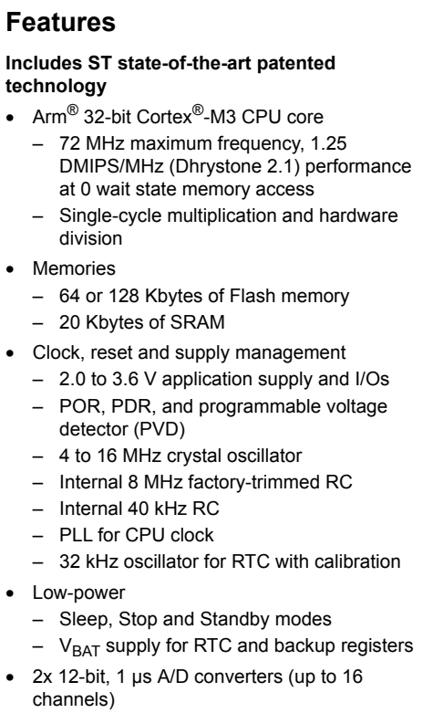 👉 64KB 또는 128KB 플래시 메모리, USB, CAN, 타이머 7개, ADC 2개, 통신 인터페이스 9개 탑재