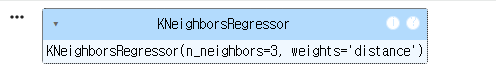 - from sklearn.neighbors import KNeighborsRegressor : K-최근접 이웃 (KNN) 알고리즘을 이용한 회귀 모델 생성