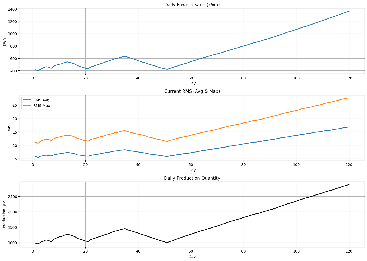 즉, 전력 사용량과 전류 RMS(평균·최대값 등)를 입력으로 사용하고, 하루 생산량을 출력으로 하는 모델을 만들면, 전력 대비 생산 효율을 정량적으로 평가하고 향후 생산량을 사전에 예측할 수 있는 환경이 구성된다.