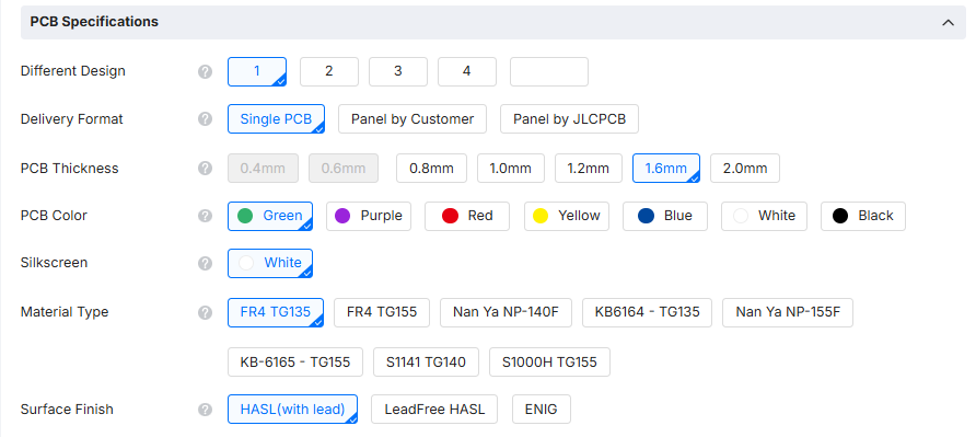 이제 JLCPCB에서 PCB 제작옵션을 선택해주어야 합니다.