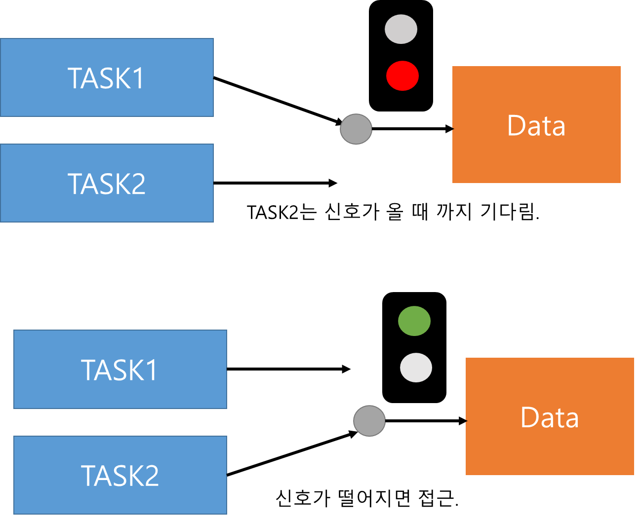 - 대신 태스크 1이 데이터를 준비한 이후에만 태스크 2가 실행되는 것을 보장한다.