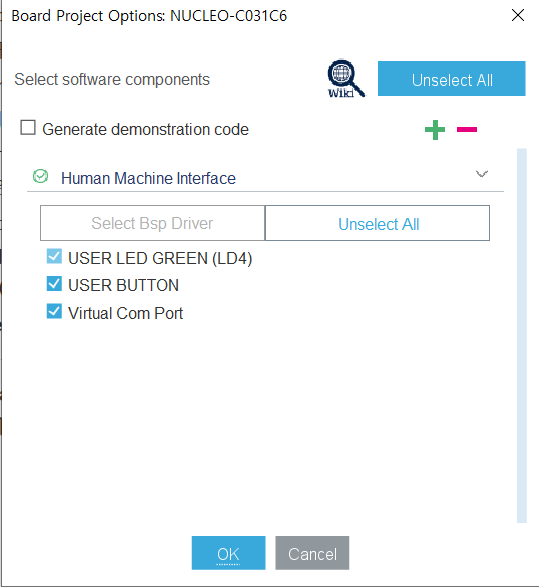 - 보드의 내부 LED와 버튼을 사용할 것인지 묻는다. OK 체크한다.