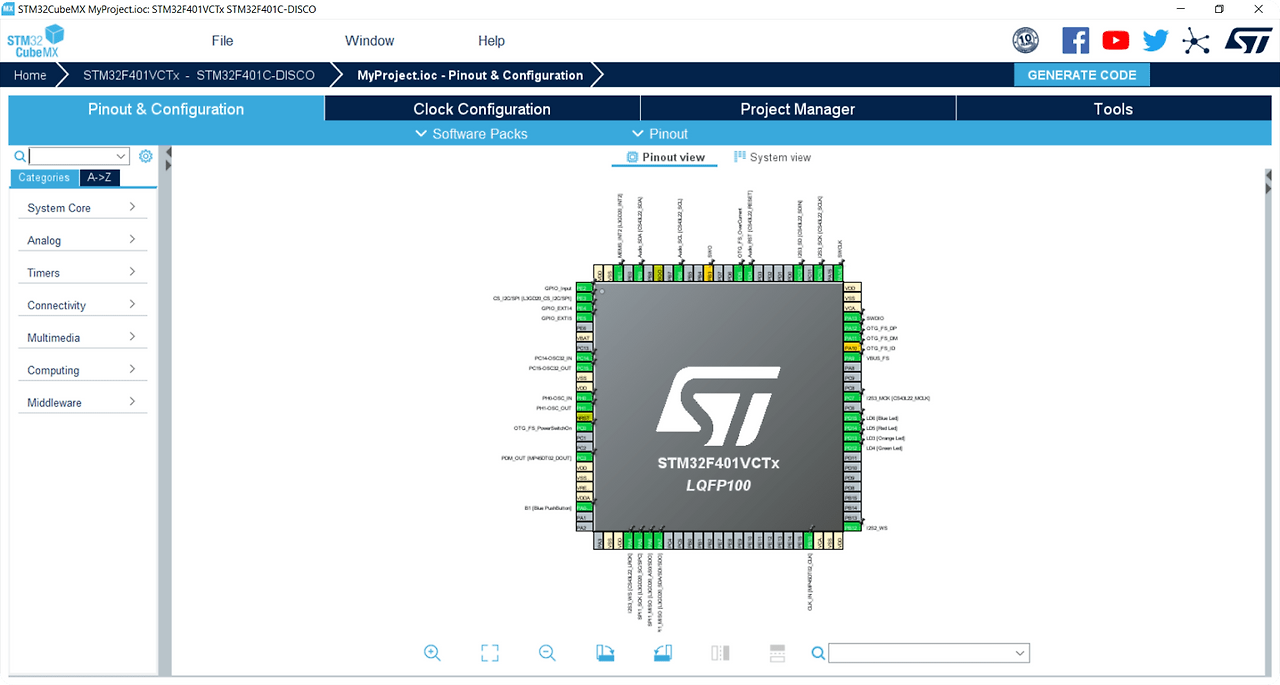 - 드디어 Cube MX 화면이다. 이 화면만은 STM32 개발만의 시그니처 예술 이라고 본다.ㅎㅎ