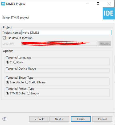 - 마지막으로 Targeted Project Type 인데 지금은 당연히 STM32 Cube 기반이다.