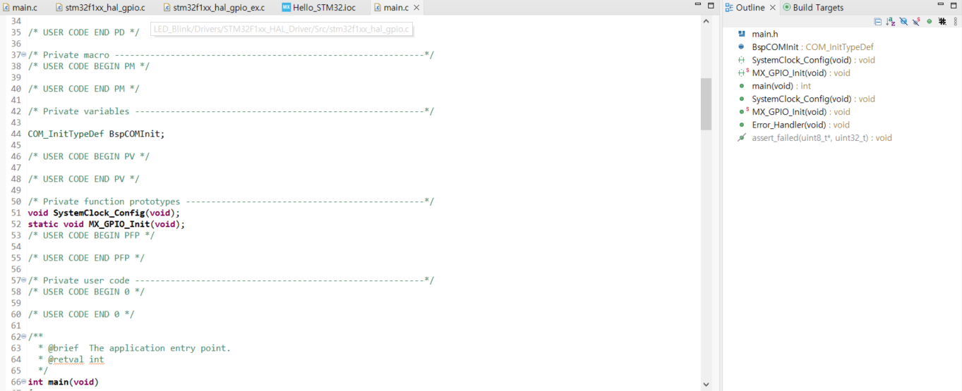 - core/ 경로는 소스 파일이 저장된다. main.c 에는 While 과 User Code 영역이 있고 gpio.c에는 CubeMX가 만든 GPIO 초기화 소스 코드가 있다.