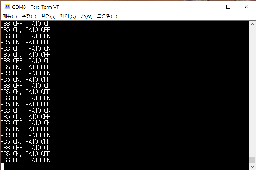 - 참고로 해당 코드는 1초간견으로 PB5와 PA10이 번갈아 Output 되며, Serial 포트를 통해 터미널에 로그를 남기는 코드이다.