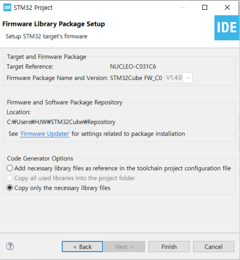 - Code Generator Options에서 Add necessary library files as reference…는 라이브러리를 프로젝트 폴더에 복사하지 않고 Repository에 있는 파일을 참조만 하는 형태이다. 이렇게 되면 라이브러리를 일일이 내부 프로젝트 폴더에 포함 시키지 않아도 된다. (프로젝트 폴더가 가벼워 진다.)