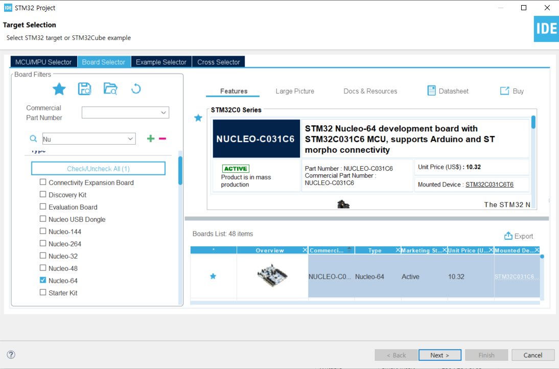 - STM32 Project 생성 후 보드를 선택한다. (Nucelo - 64)