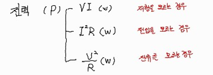 전압이나 전류를 모를 경우 I^2 * R 이나 V^2/R 공식을 사용하여 저항을 통한 식으로 구할 수 도 있다.