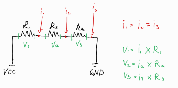 직렬 저항의 전류는 항상 같지만, 그 해당 저항에는 옴의법칙 ( V = I*R )에 의한 전압이 걸린다.