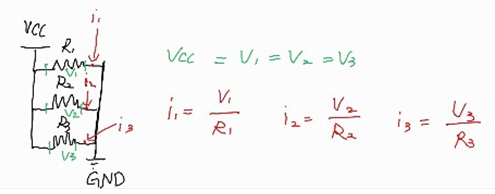 병렬 회로에서 각 소자는 공급 된 전압과 같지만, 그 해당 저항에는 옴의법칙 (I = V/R)에 의한 전류가 걸린다.