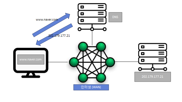 사용자가 웹 브라우저에 www.naver.com 을 입력하면 DNS 서버에 naver.com의 주소가 무엇인지 질의하고 DNS서버는 naver.com의 IP주소가 202.179.177.21이라고 사용자에게 알려준다.