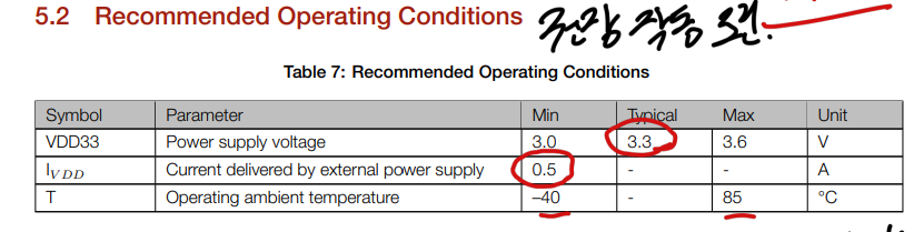 VDD33은 전원 공급 부분인데 -0.3V ~ 3.6V 를 인가하라고 되어있다.