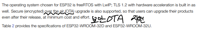 ESP32-WROOM-32는 임베디드 실시간 OS인 freeRTOS도 지원한다. 또한 보안 OTA(Over the Air, 무선 F/W 업데이트) 기능을 지원한다고 한다. OTA의 경우는 매우 필요한 기능인데 보안OTA에 대해서는 한번 알아봐야겠다.