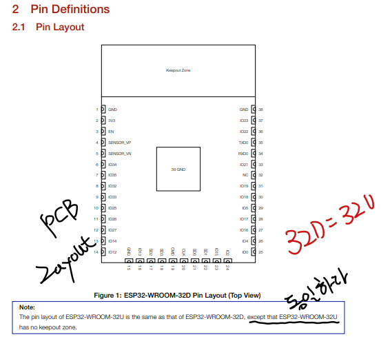 핀에 대한 PCB레이아웃 도식이다. 데이터시트에서는 32D를 기준으로 두었지만, 아래 Note에 32U는 크기만 다르고 핀맵은 동일하다고 명시되어있다.