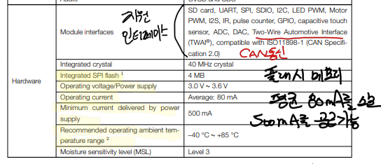 이 MCU의 평균 전류는 80mA라고 한다. 평균적으로 MCU에서만 평균적으로 80mA를 소모한다는 이야기가 되겠다. (*참고로 WiFi기능을 사용하면 최대 240mA까지 소모한다고 한다.)