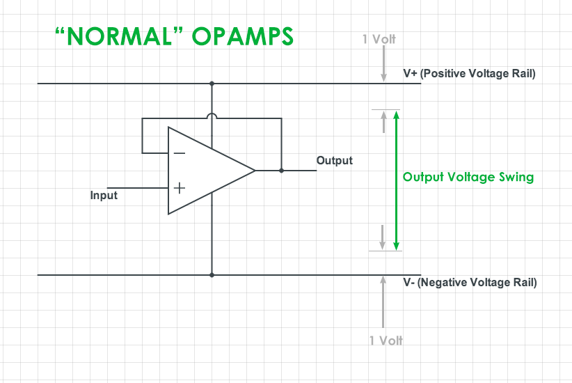 - 일반 OPAMP : 입력 전원의 전체 전압 범위를 사용하지는 못함