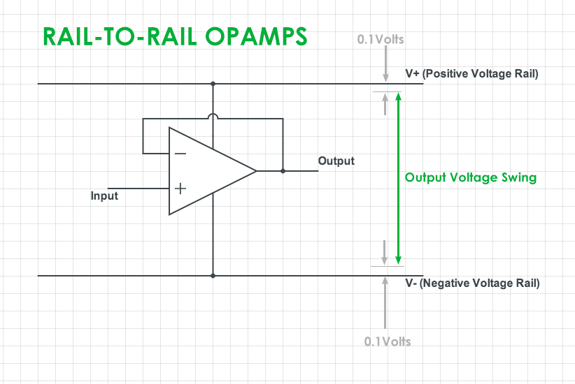 - Rail to Rail OPAMP : 공급되는 전원 전압의 범위 까지 거의 출력이 가능