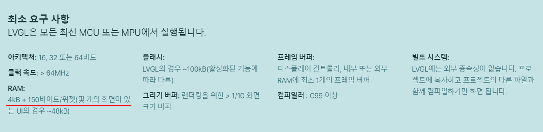 생각보다 LVGL 라이브러리 에서는 MCU의 메모리가 많이 요구되지 않는다.