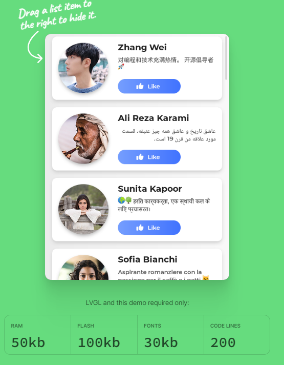 놀랍게도 이런 근사한 GUI가 50kb의 RAM과 100kb의 ROM 이 사용되었다고 한다. 역시 임베디드를 위한 LVGL은 최고의 라이브러리라고 생각된다.
