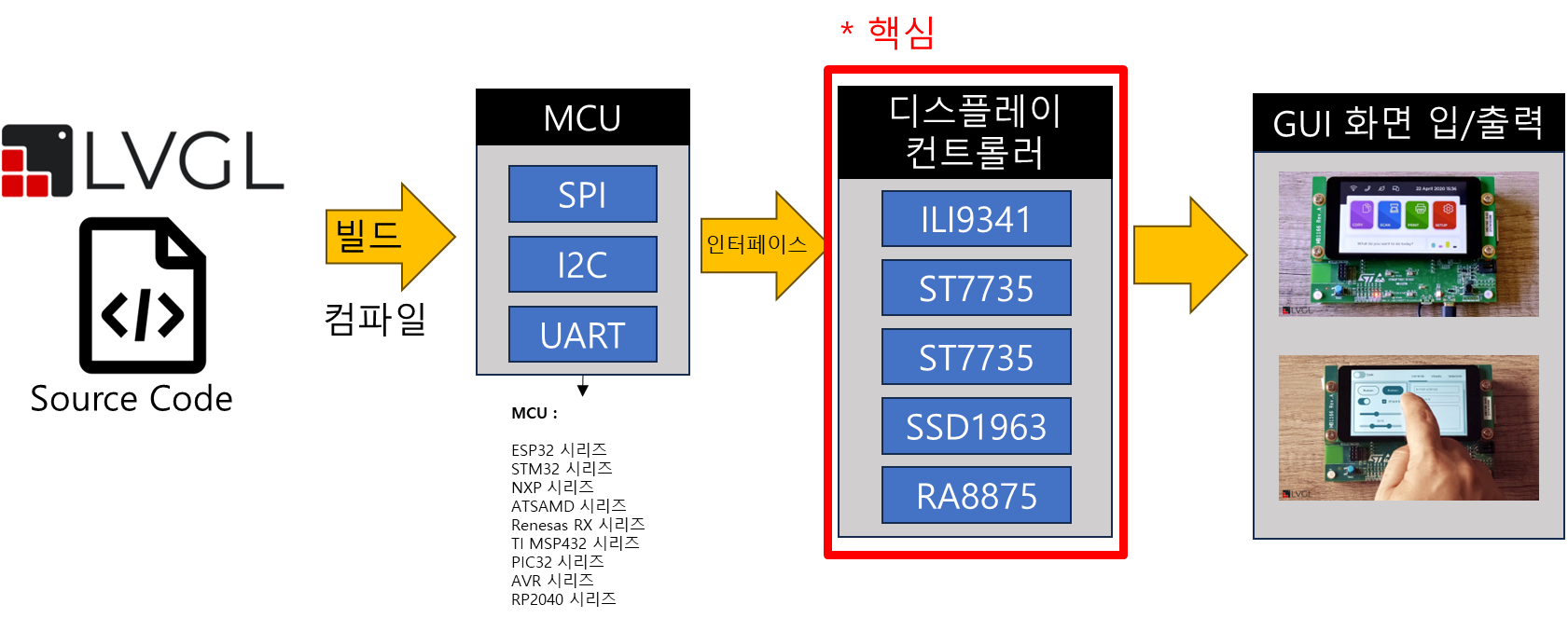 - LVGL을 MCU에 빌드하여 디스플레이 컨트롤러(IC칩)와 연결되고 제어 하여 화면 출력을 구현할 수 있다.