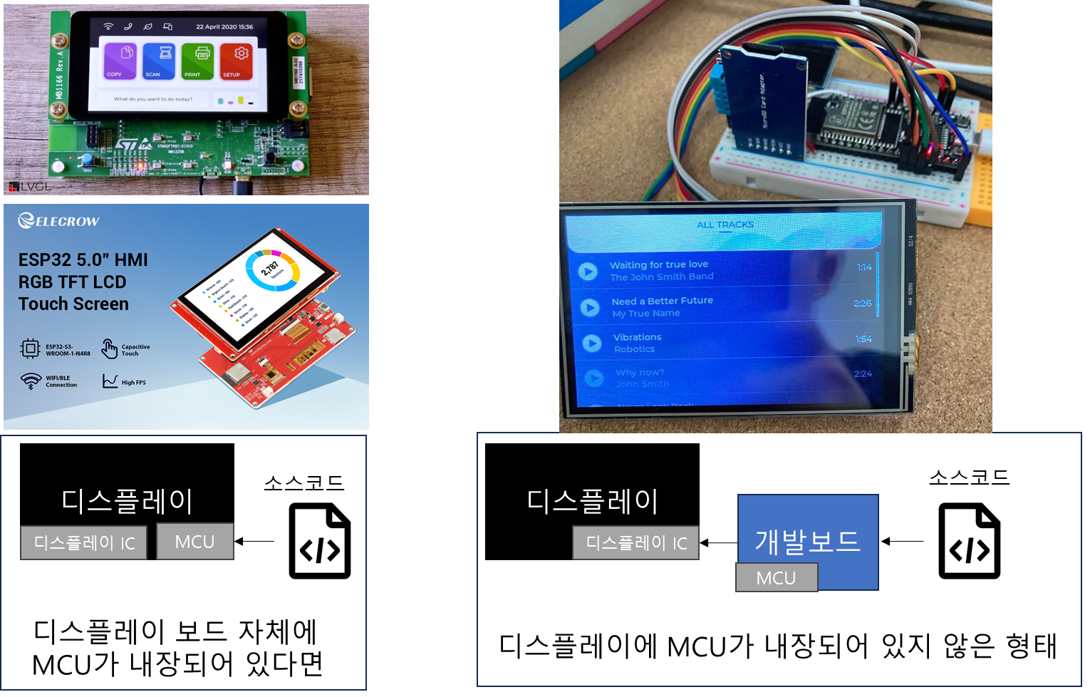 - 디스플레이 모듈에 MCU가 탑재 되어 있지 않은 형태라면 개발보드를 사용하여 디스플레이(컨트롤러 IC)와 배선하여 LVGL 자체를 개발보드에 빌드하여 개발해야한다.